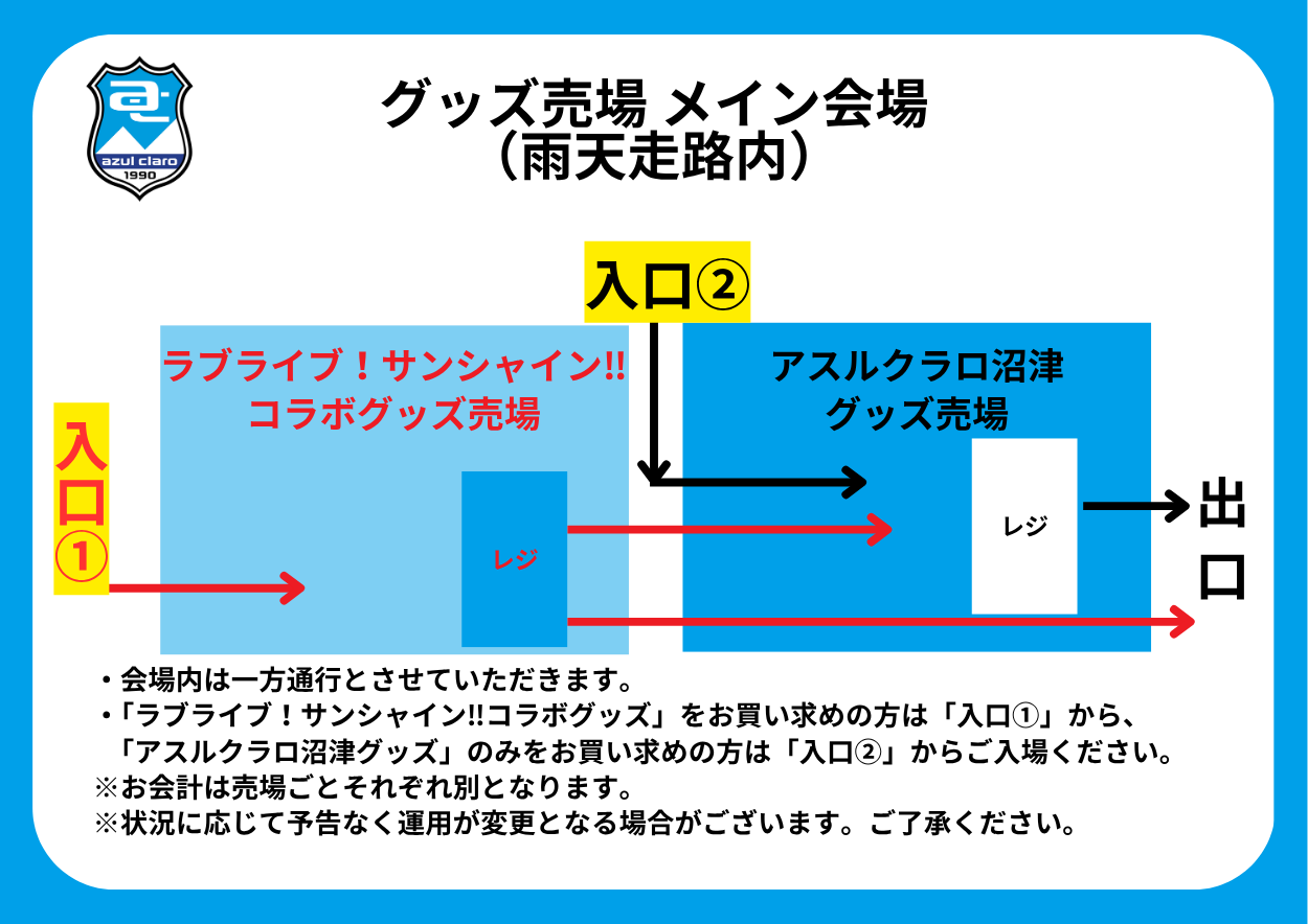 販売スペースを「ラブライブ!サンシャイン‼︎コラボグッズ」と「アスルクラロ沼津オフィシャルグッズ」にわけ、それぞれ入口を「入口①」と「入口②」2箇所設けます。