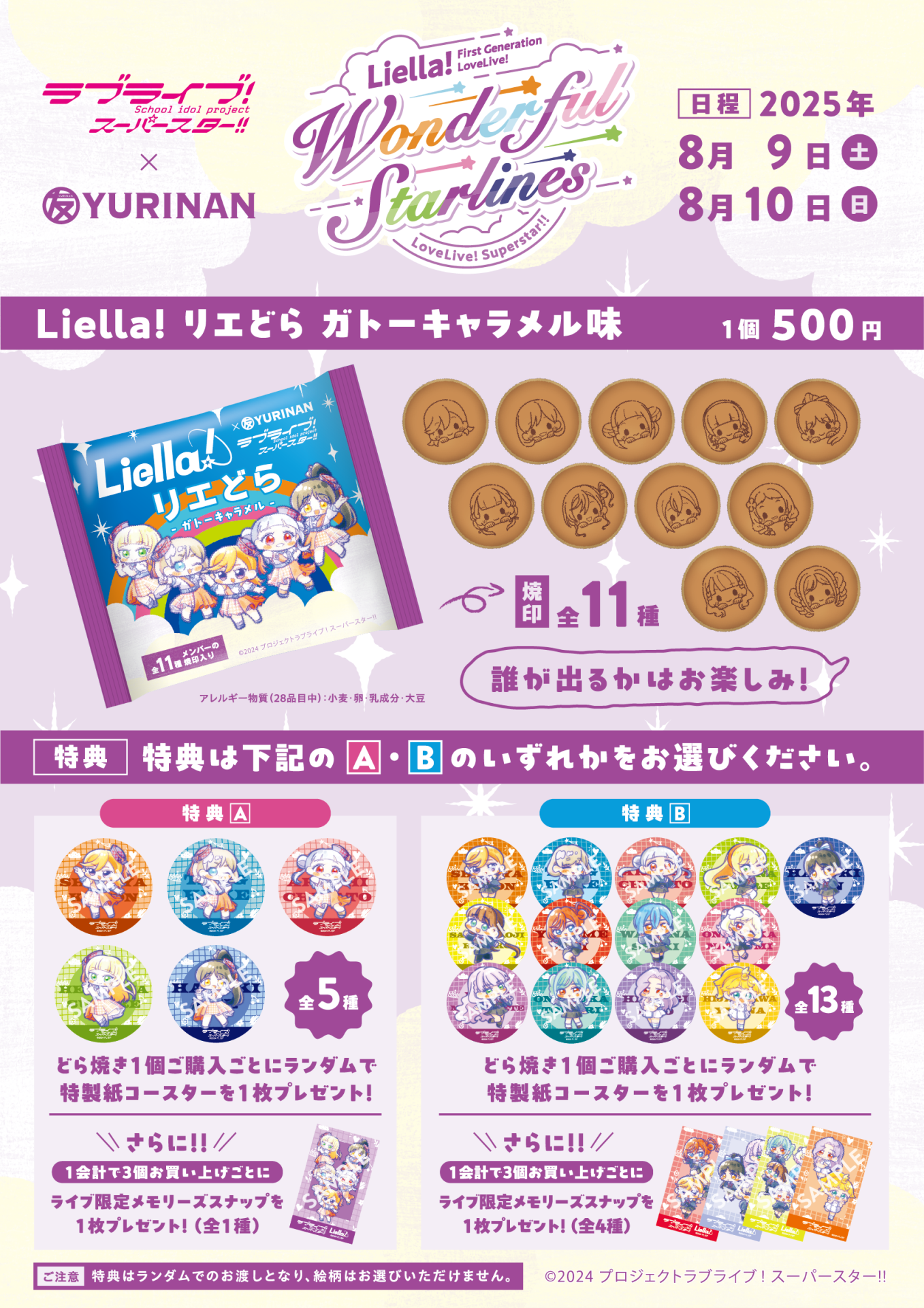 <東京公演>では、どら焼き1個ご購入ごとに特製紙コースター(A・Bのいずれかをお選びいただき)をランダムで1枚プレゼント!