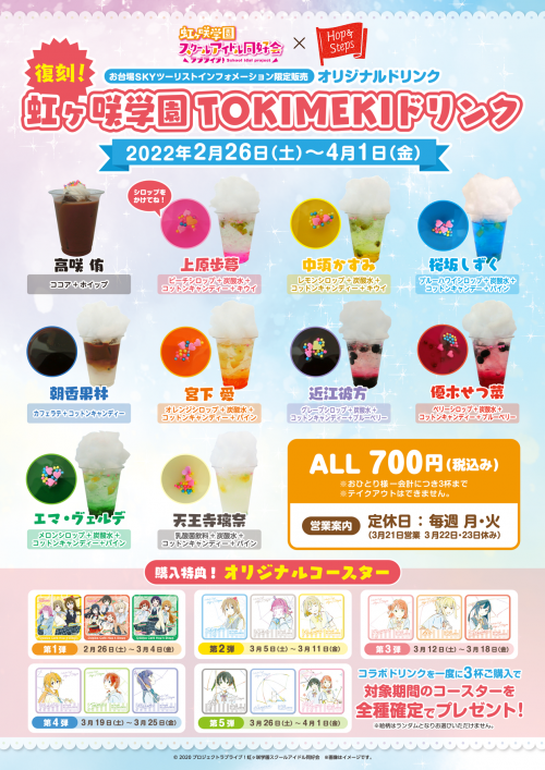 お台場にある観光案内所『お台場SKYツーリストインフォメーション』にて『虹ヶ咲学園TOKIMEKIドリンク』復刻販売が決定!